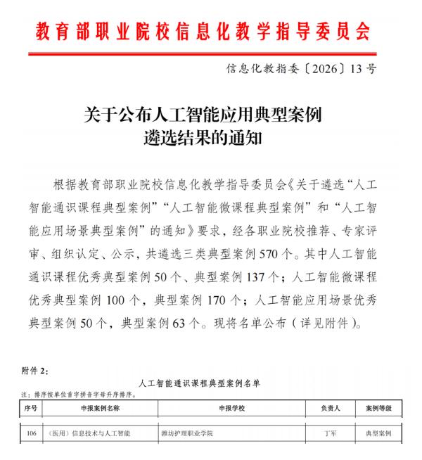 此次案例入选,是学院推动人工智能技术与专业教育教学深度融合、深化思政课程与课程思政融合创新的实践成果。案例立足医药卫生职业教育育人特色,将人工智能通识教育与医用信息技术教学有机结合,着力培育医学生的数字素养与科学思维,为职业院校人工智能通识课程建设提供了可借鉴的实践路径。