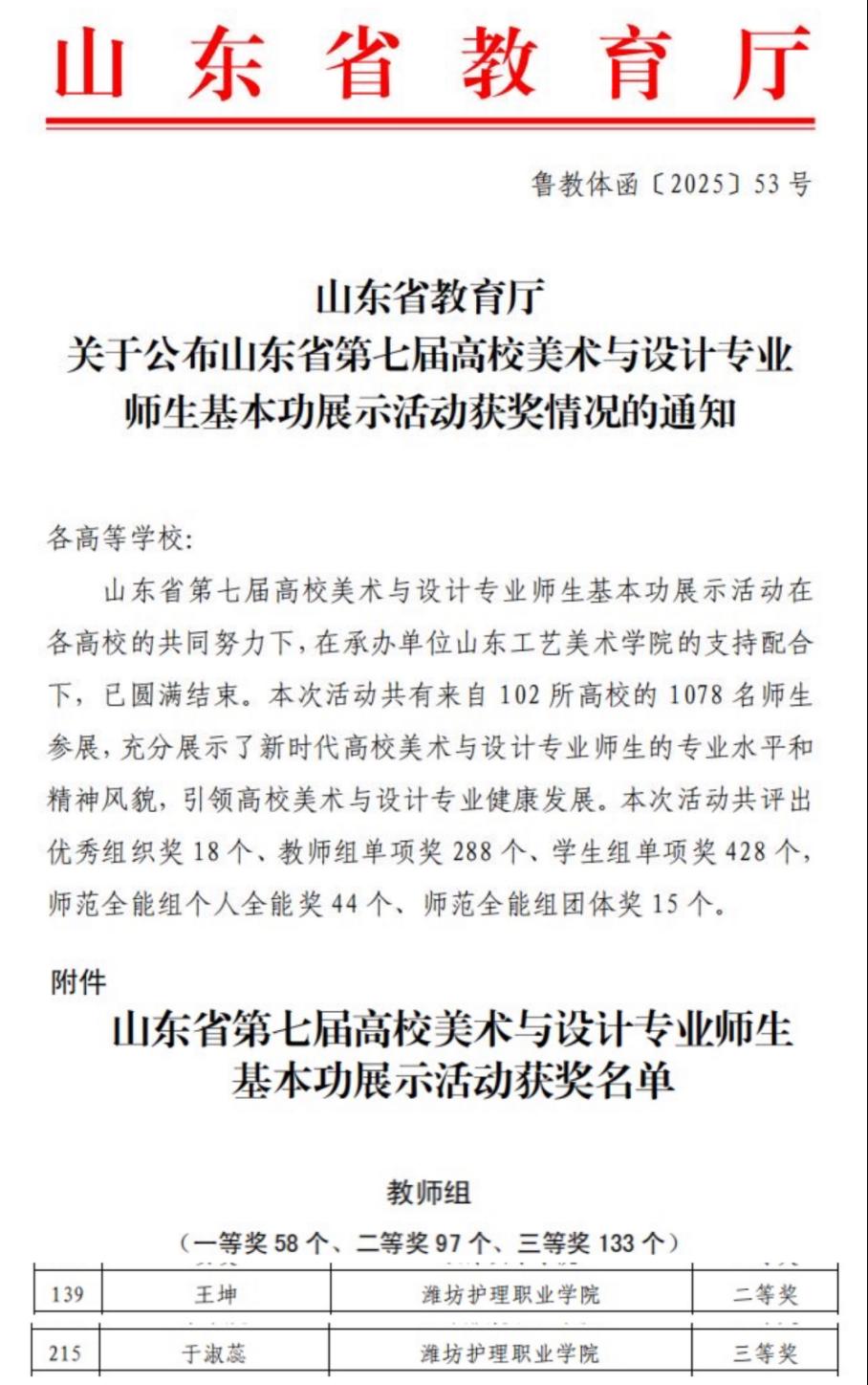 近日,山东省第七届高校美术与设计专业师生基本功展示活动获奖名单公布。我校王坤、于淑蕊两位教师分获二等奖和三等奖,实现了我校在该项省级权威赛事中获奖“零的突破”。